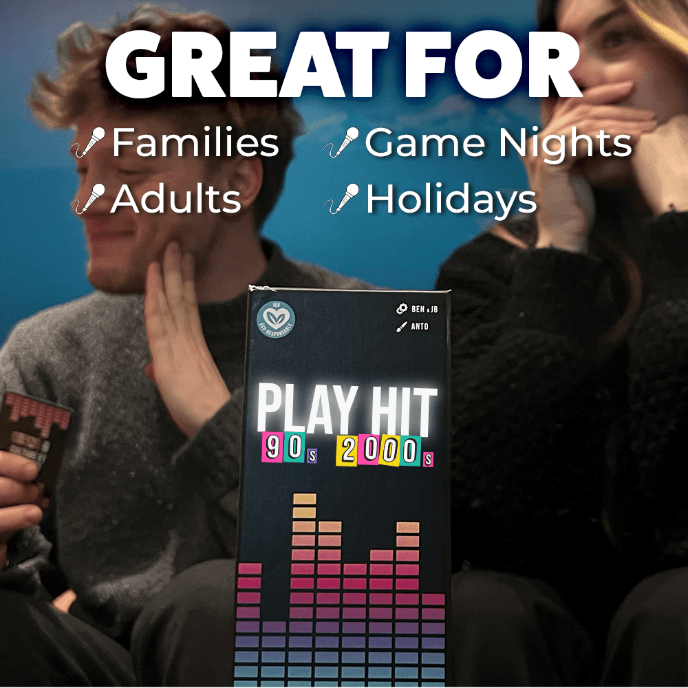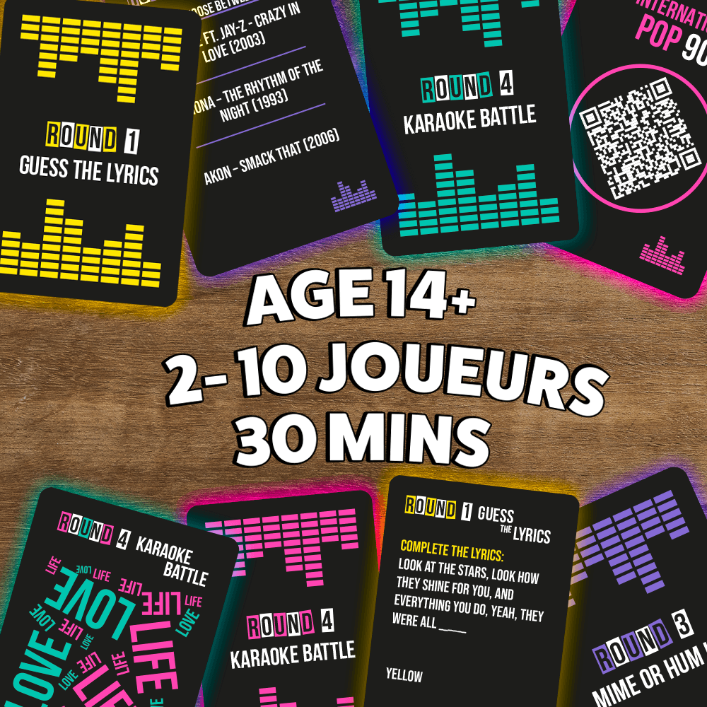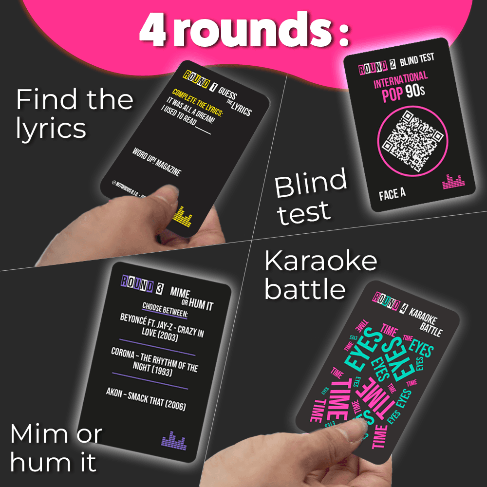 A must-have game to keep on hand, guaranteed to create a great atmosphere. You'll rediscover some of the most popular songs from the late 80s, 90s, and 2000s… pure nostalgia!